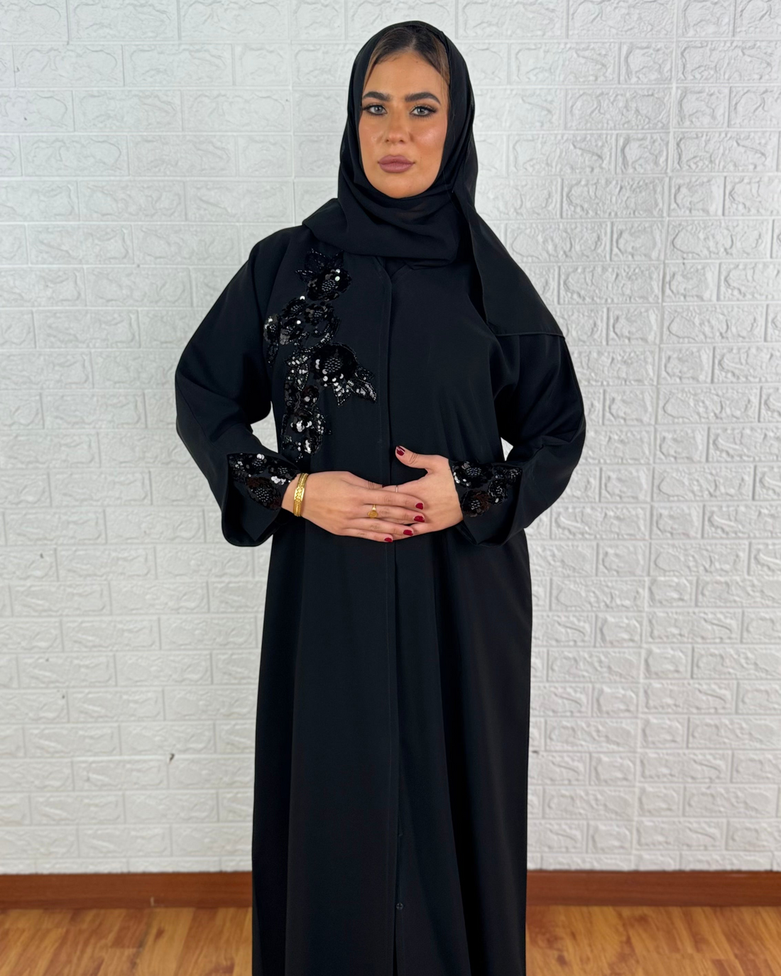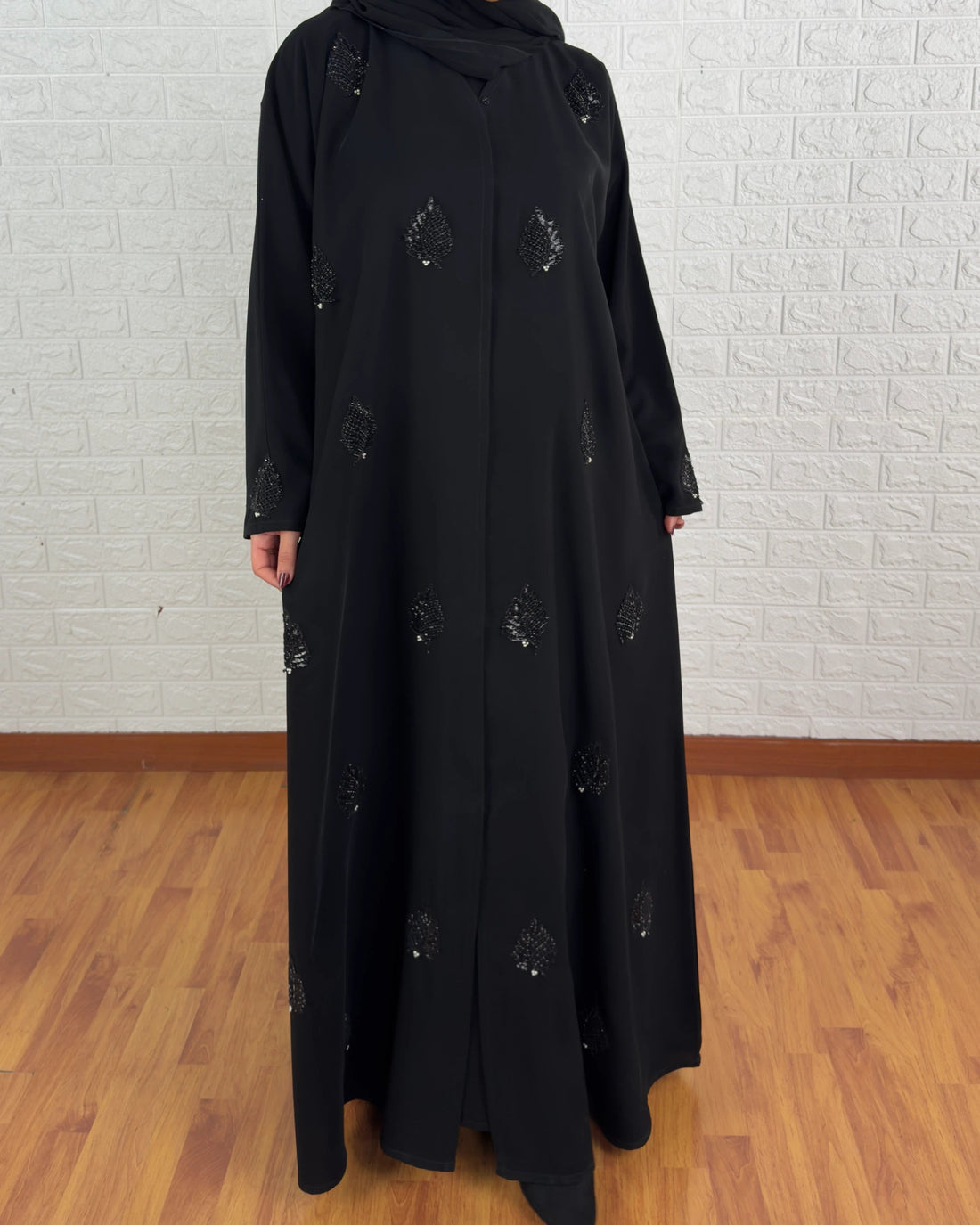 Nicly decorated abaya with leafs shapes and Lulu-like stones Fabric: Barbie crepe Hand made Black...